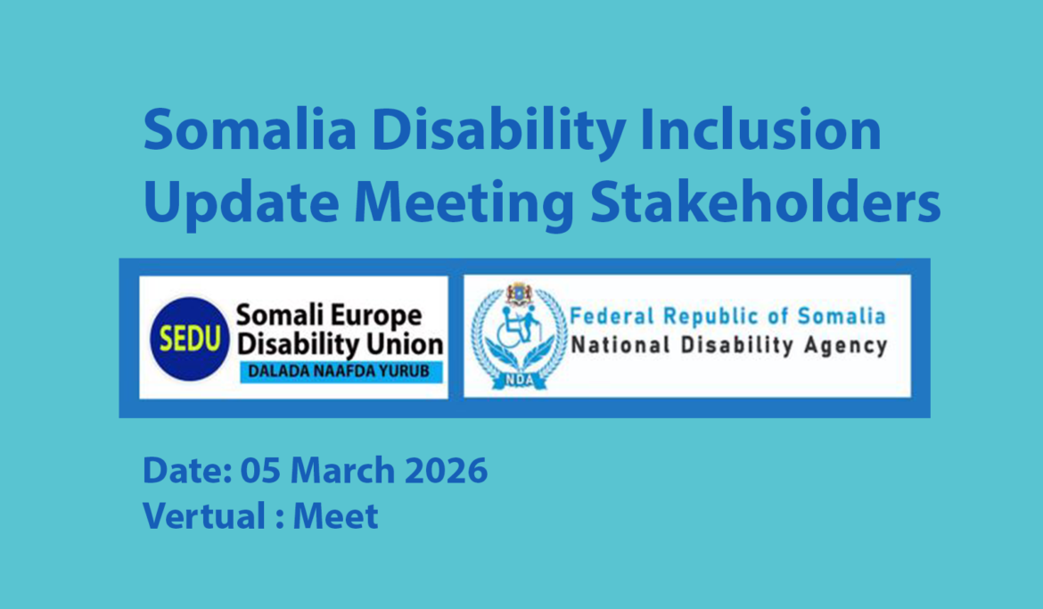 On 05 March 2026, as part of activities marking International Disability Awareness Month, a virtual Disability Inclusion Consultation Meeting was organized by the SEDU – Somalia European Disability Union Coalition based in Sweden. The meeting aimed to strengthen collaboration among organizations working on disability inclusion in Somalia and to discuss ways to improve coordination in humanitarian, development, and rehabilitation programs.